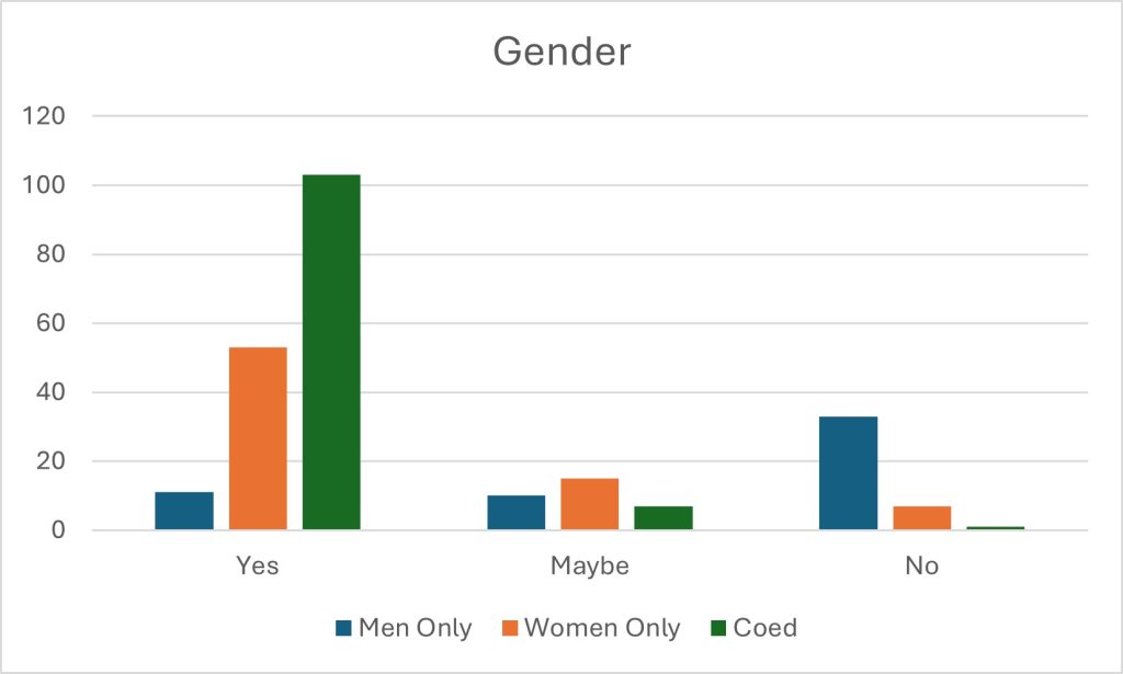 Coed games were preferred nearly 2 to 1 over same-gender games, with male-only games making up a notable portion of a relatively small number of responses.