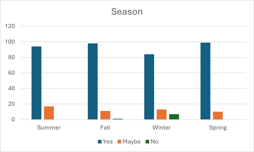 The distribution across the seasons was fairly even, with spring, summer, and fall equally represented, and winter only a few points behind.